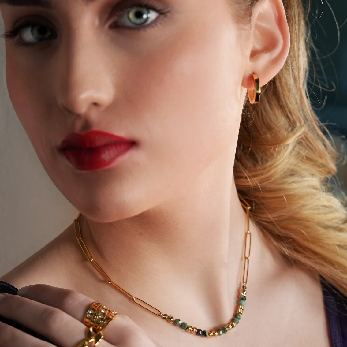 • Elevate your style with this stunning accessory that effortlessly combines the earthy allure of African Turquoise with the opulence of gold beads, intricately woven into a stylish paper-clip chain.
