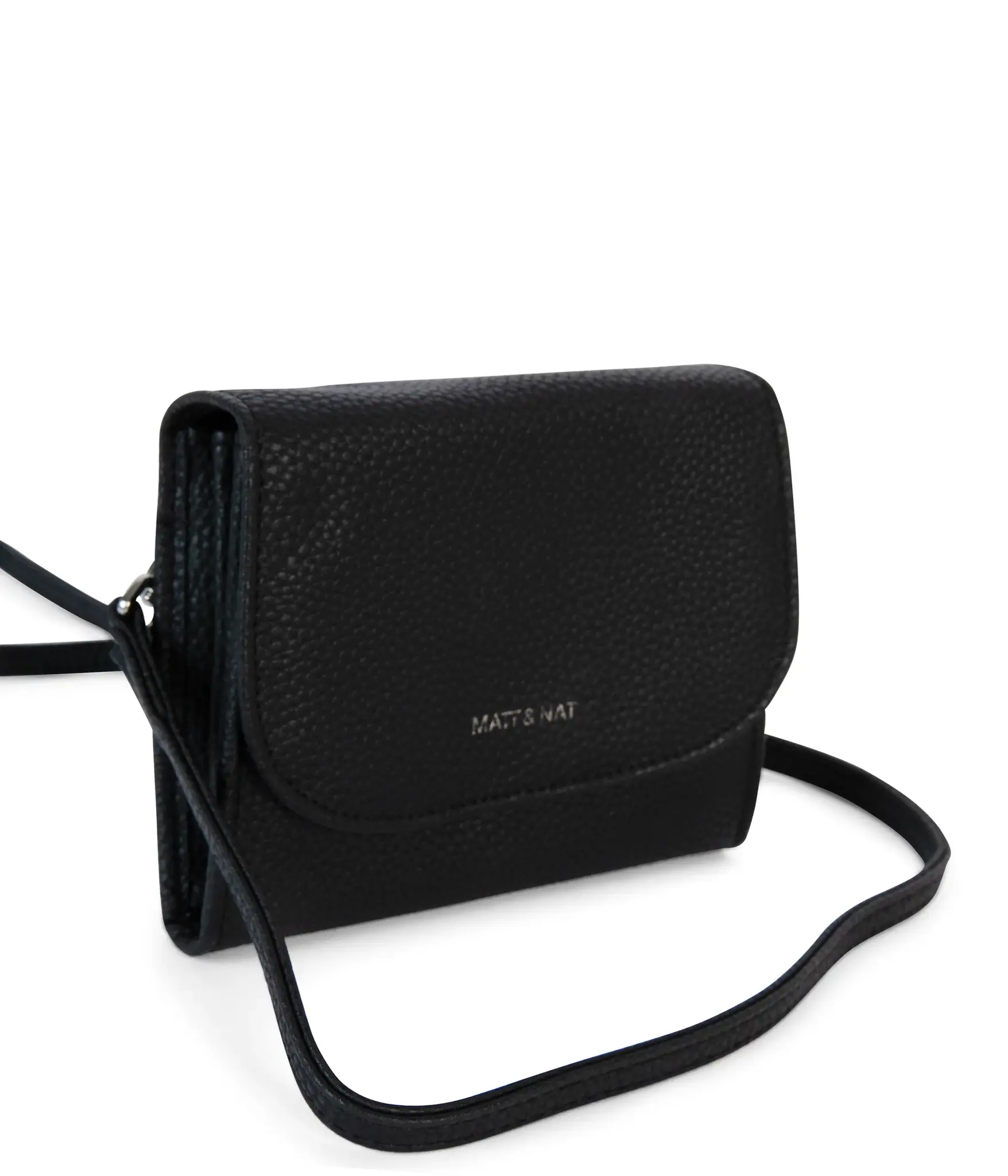 Wallet with a removable crossbody strap, flap closure, slip pocket at exterior back, 8 credit card slots, and a zippered coin pocket at interior.