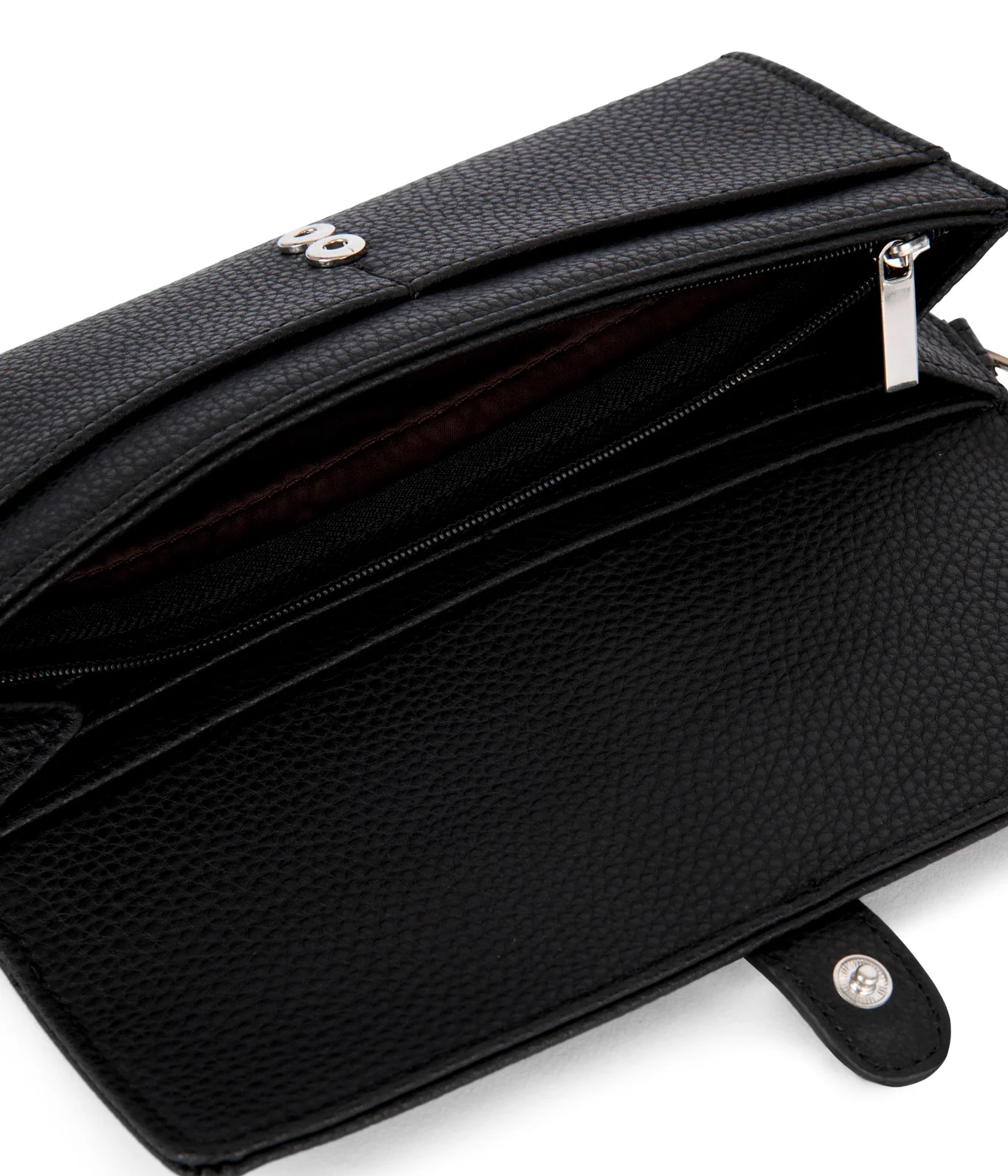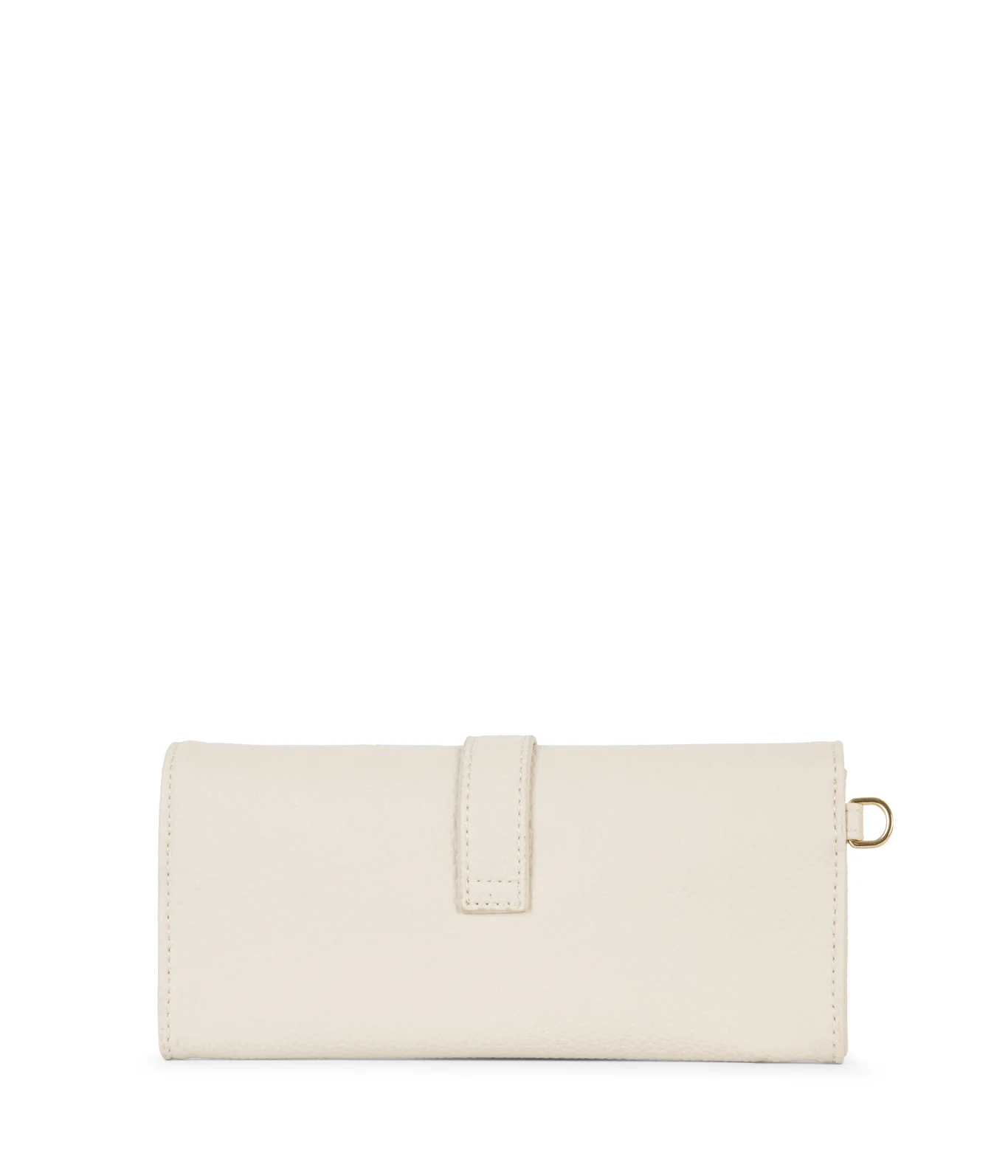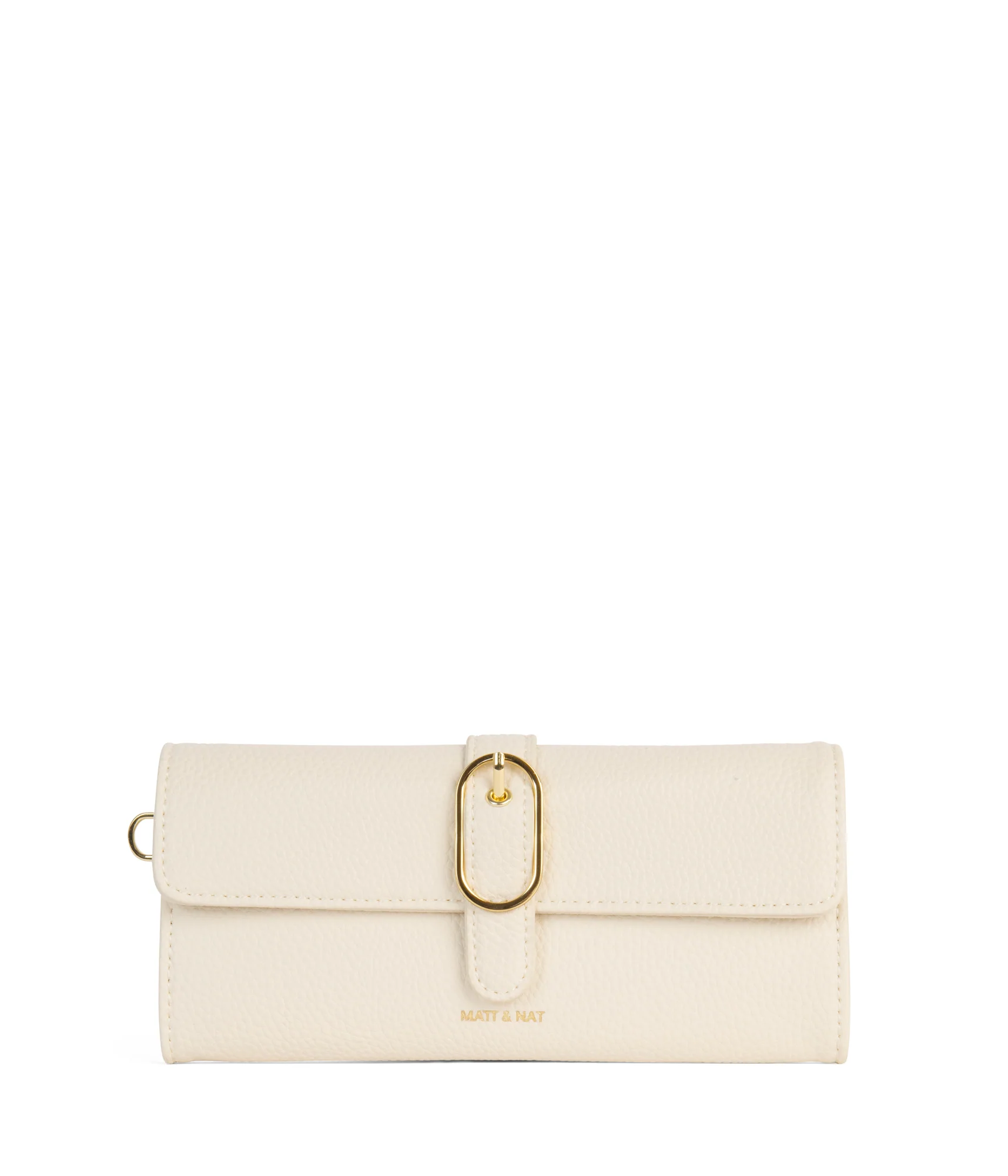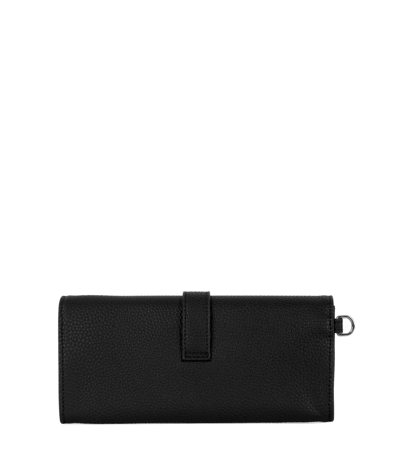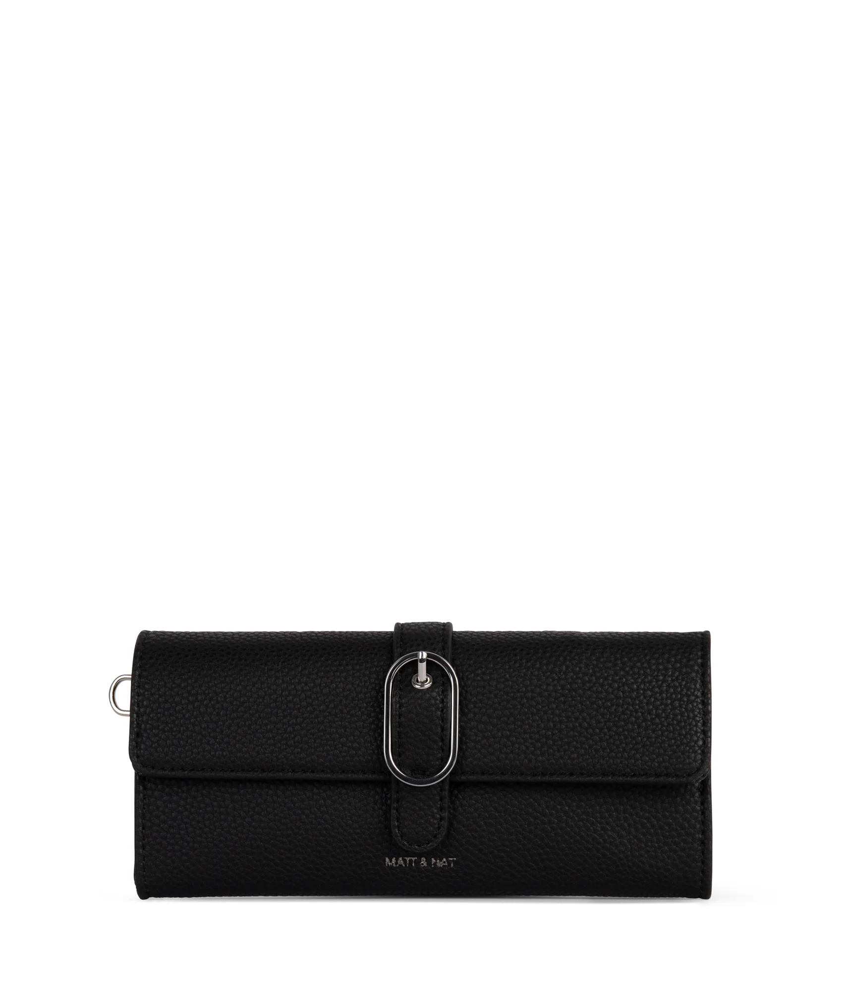 • A roomy vegan wallet with flap closure, decorative buckle and detachable wristlet. Features slots for cards, bills and a zippered coin pocket — perfect for everyday essentials and pairs with any bag