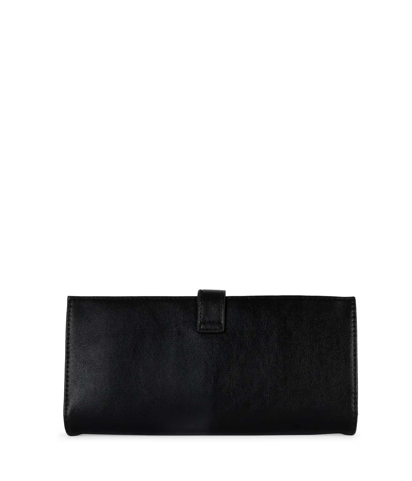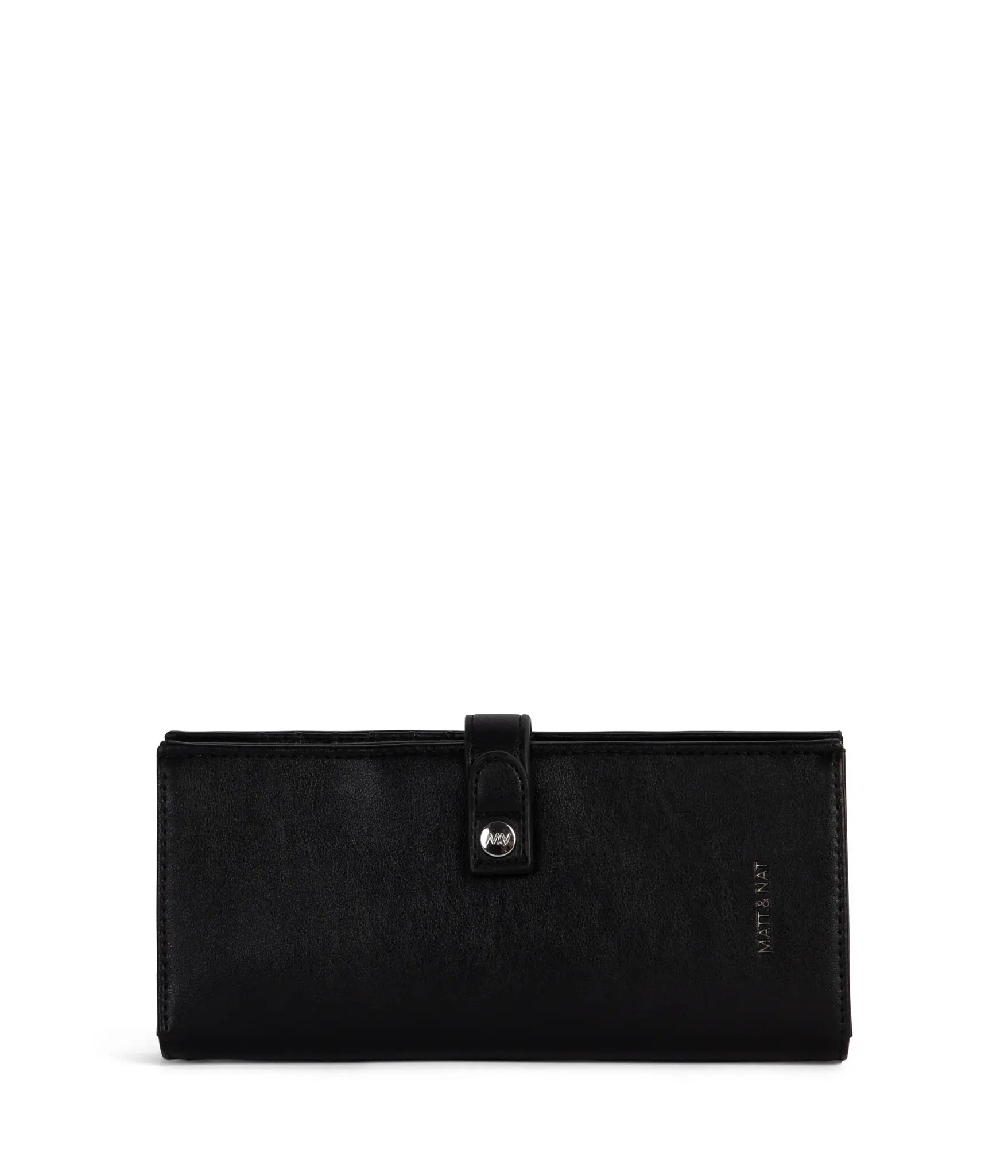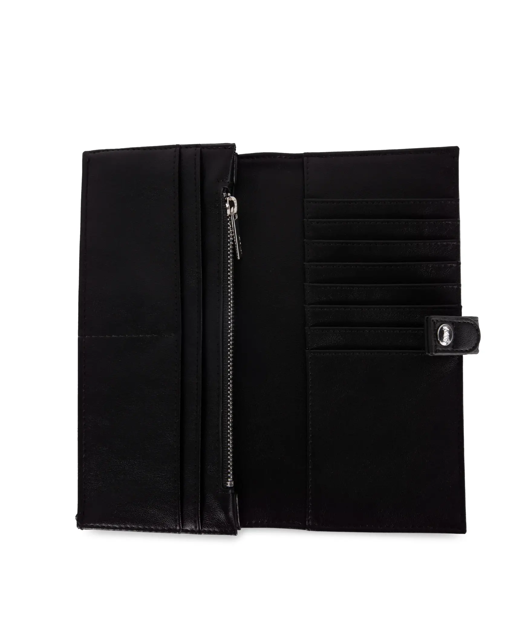 Folded wallet with snap closure, with card slots, bill slots, and a large zippered coin pocket inside.